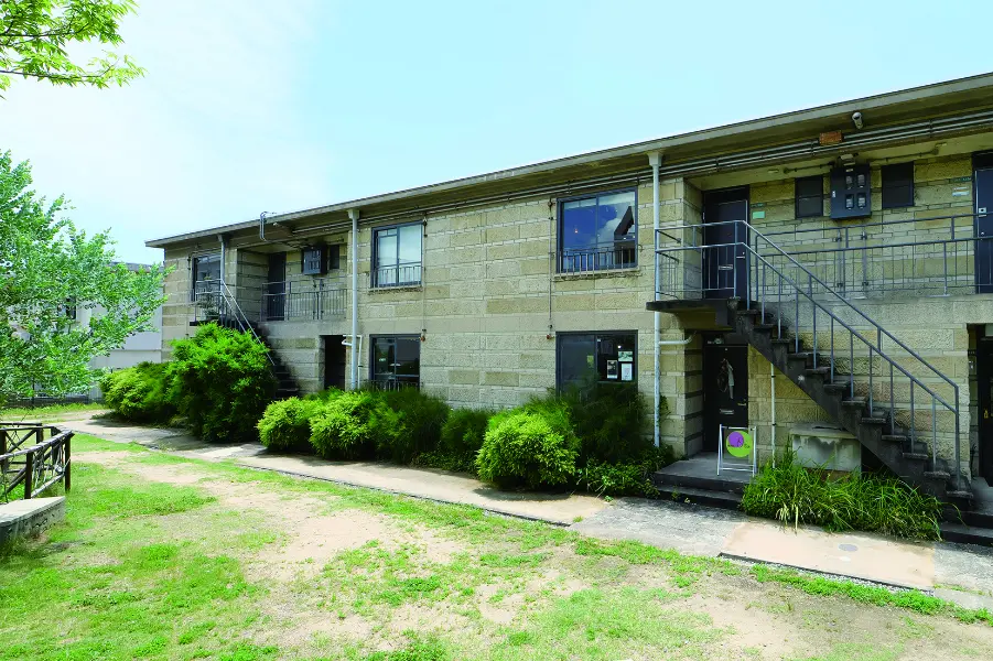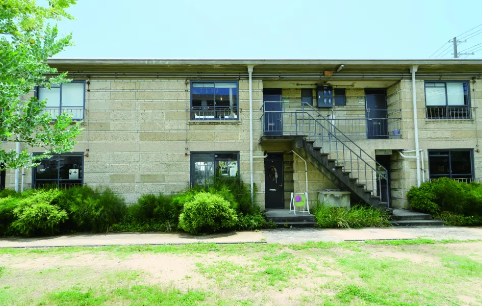 戦後復興期に建てられた市営住宅「旧宮塚町住宅」。石造りの外観が特徴的。内部をリノベーションし、店舗などに使われている。