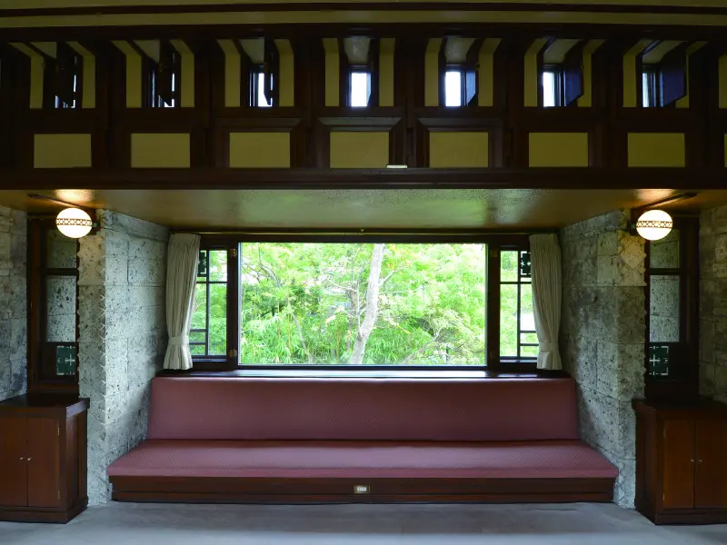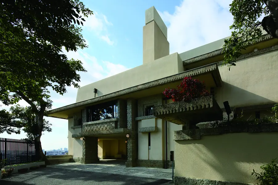「ヨドコウ迎賓館〈旧山邑家住宅〉」はフランク・ロイド・ライトが、酒造業を営む山邑家の別邸として設計。大谷石を使用した外壁や飾り銅板などが特徴。