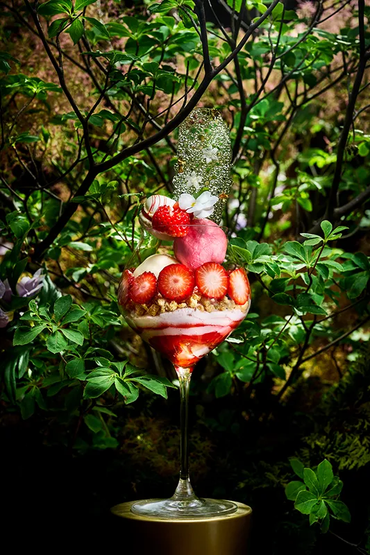 パフェは、トップの金箔とペンタスの花を散りばめた涼やかな飴細工から始まり、夏いちごがジュレやシャンティなどさまざまな形にアレンジされています。鮮やかな赤が織りなすいちごの華やかな色彩が目を惹き、夏の暑さを忘れさせるパワフルな美しさです。