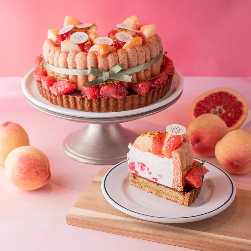 国産白桃のやさしい甘さに、ピンクグレープフルーツの爽やかな酸味が特徴。杏仁リキュールを効かせたココナッツミルクと練乳のムースがふわりと広がり、サワークリームの軽やかな酸味がアクセントになっています。