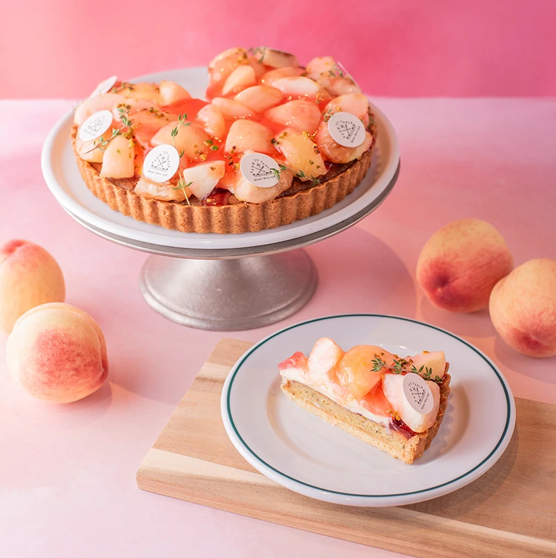 アールグレイの茶葉とハチミツを生地に練り込んで焼き上げたタルトに重なるのは、甘酸っぱいフランボワーズジャムとなめらかなカスタード。さらに、白桃がたっぷりトッピングされています。