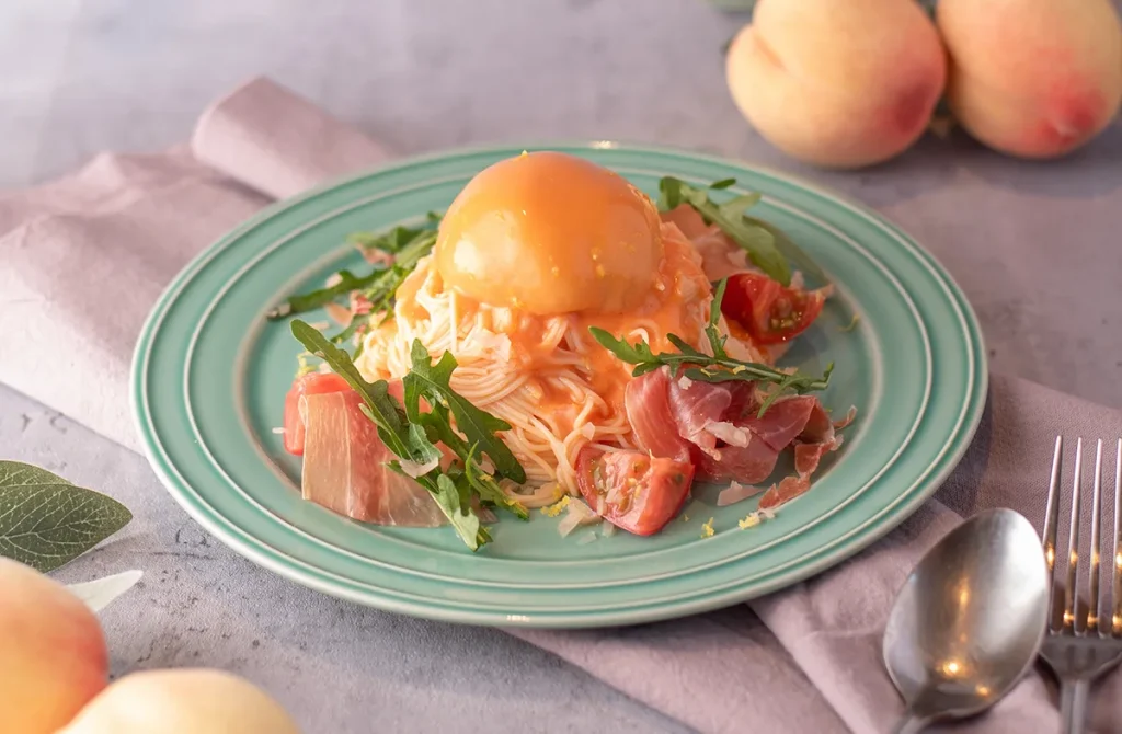 白桃のコンポートとうれしおとまとの冷製カッペリーニ