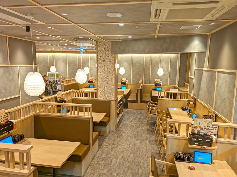 通路幅が広く取られ、カウンター席とテーブル席が用意されています。車いすやベビーカーの利用者も、店舗入り口から席まで店内をスムーズに移動できます。ベビーカーもそのまま着席できます。