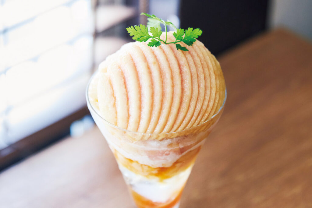 生の桃、桃シャーベット、アイスクリーム、ソフトクリーム、桃のグラニテと見た目から想像する以上に桃のフレッシュな味わいが堪能できるパフェは1,500円。