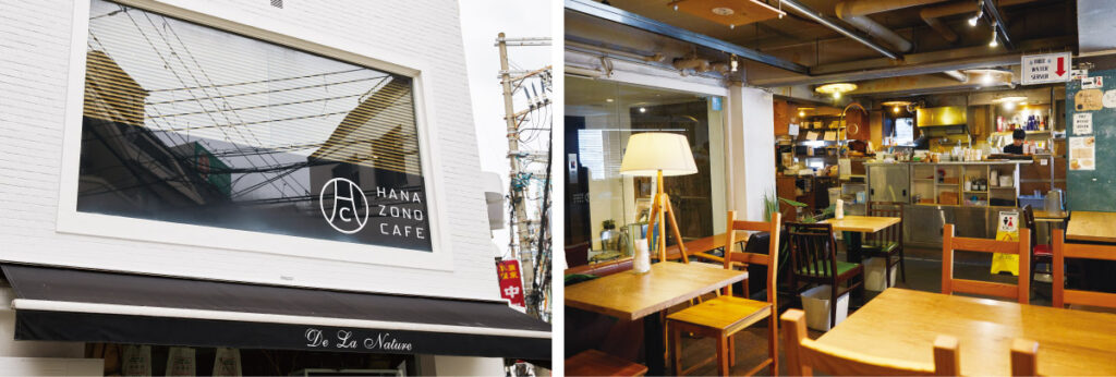 左/HANAZONO CAFEがあるのは白×黒の外観がモダンなビルの2階。