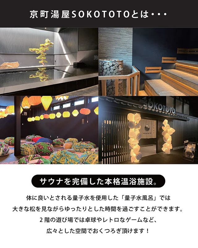 さらに、BBQを楽しんだあとに、話題の温浴施設「京町湯屋SOKOTOTO」でリラックスできる特典も。話題の量子水風呂やサウナで“ととのう”体験が無料で付いてくるのは、このプランだけ!