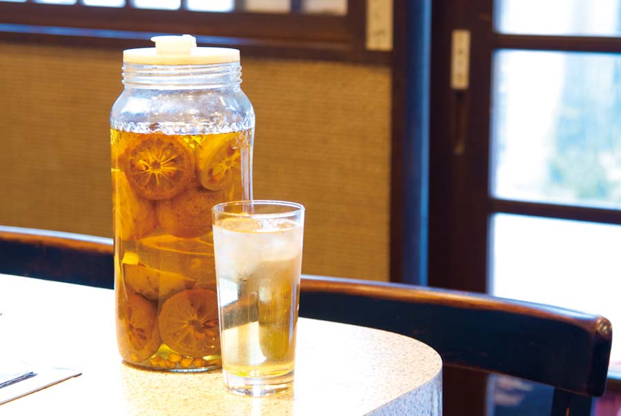 果実酒は自家製。プラムや杏など季節に合わせて変わる。「ゆず酒 ソーダ割」720円は優しい味わいで癒やされる。