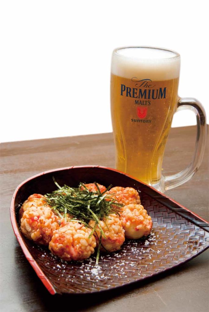 阪急南方駅の改札口を出ると漂う、いい香りの元がこちら。銅板を覆うほど大量の天かすを生地に巻き込むように焼き、外側をカリっと仕上げるのが十八番流。牛乳と出汁(だし)をブレンドしたクリーミーな生地も絶品。アツアツを頬張りながら飲む、キリッと冷えた生ビールがたまらない!