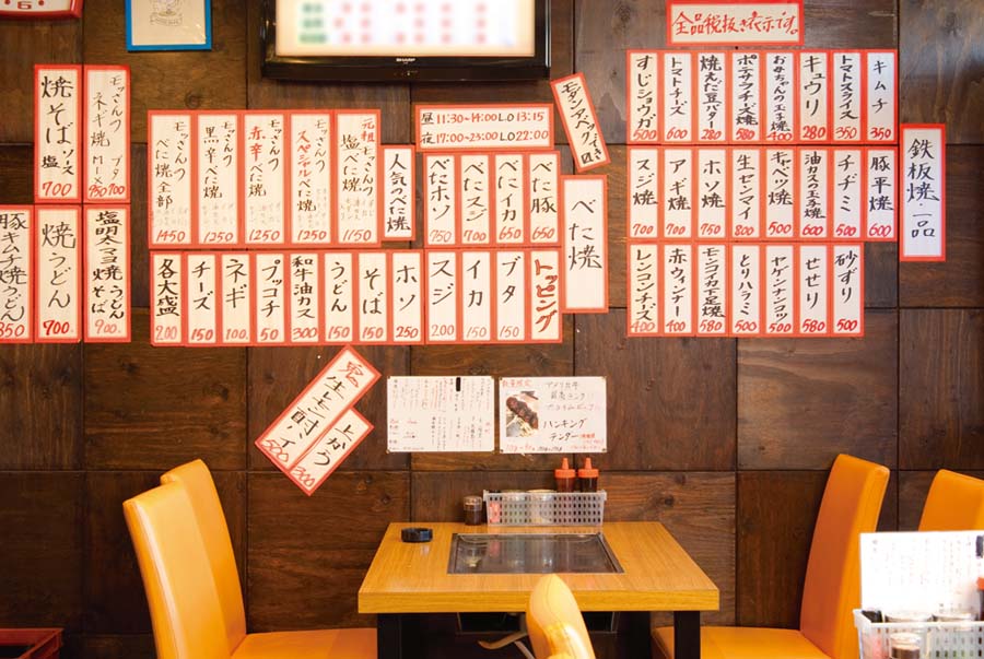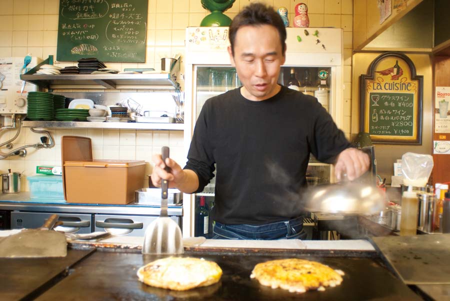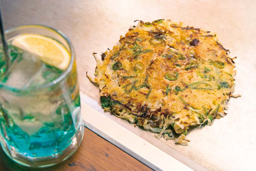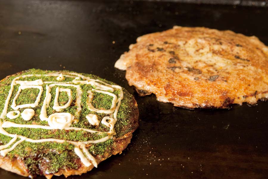 「この辺りはたっぷりのキャベツに薄く溶いた生地をかけながら蒸し焼きにするのが定番」という店主。コロッケや餃子などを挟むトッピングもユニークだ。オーダーすればマヨネーズで絵を描いてくれるサービスも魅力的。「あごすじ塩焼き」800円など、酒に合うアテも豊富にそろう。