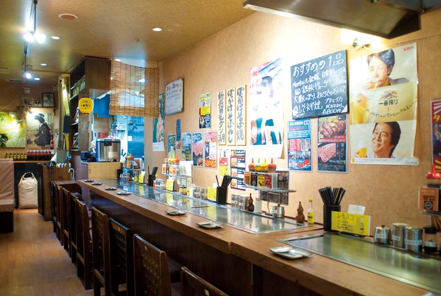カウンターにも鉄板があり、アツアツを食べられる。テーブル席も2つある。