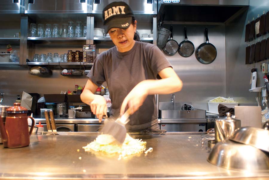 宝塚で35年以上愛される同店には、近郊の野菜や魚介を使った鉄板料理を求め、タカラジェンヌも多く訪れる。バターで炒めた大ぶりのタコが乗る「海鮮ミックス」は、エビやイカも入っていてとても贅沢(ぜいたく)。口の中でほどける軽い生地で、女性もぺろりと食べられる。