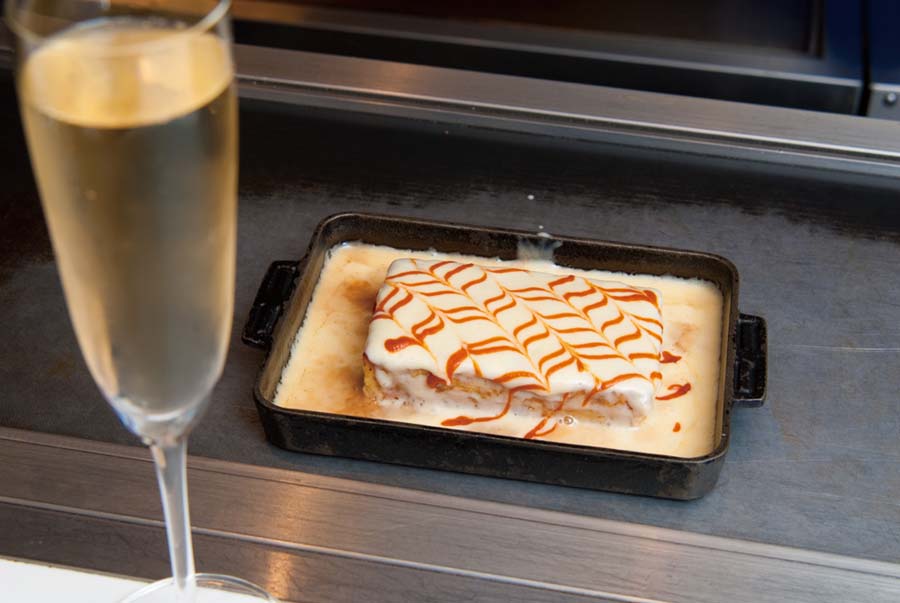 阪急梅田駅茶屋町口からすぐ、連日行列のフレンチバル。フレンチ風お好み焼き「サヴォワ」は3種の欧州チーズと白ワインのコク深いソースが、ふわふわの生地と相性抜群! さっぱり辛口のシャンパンを合わせるのが乙だ。