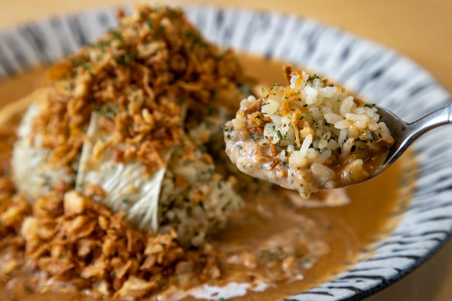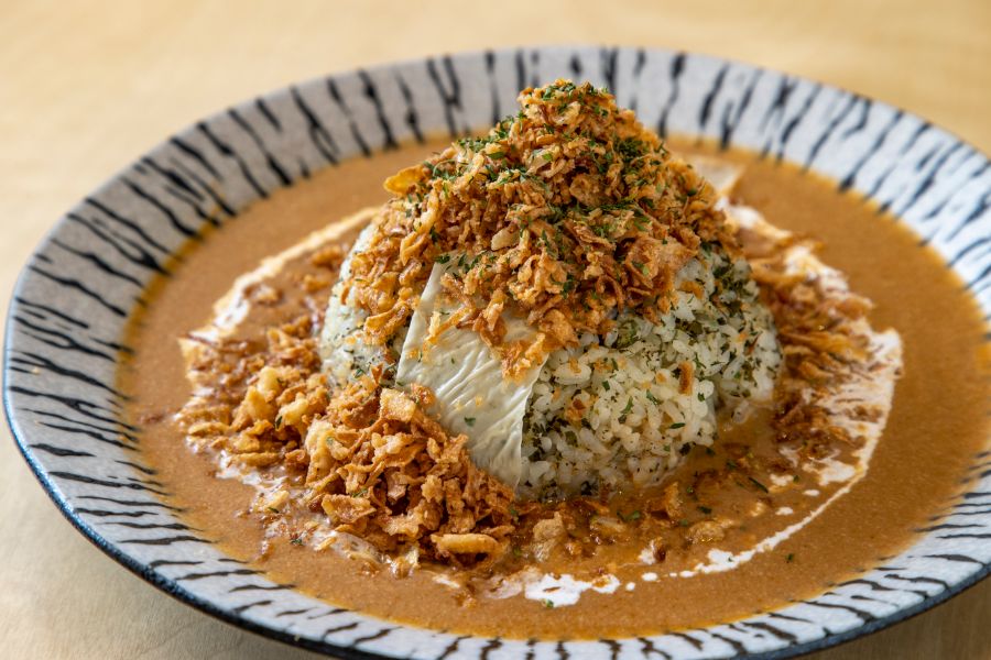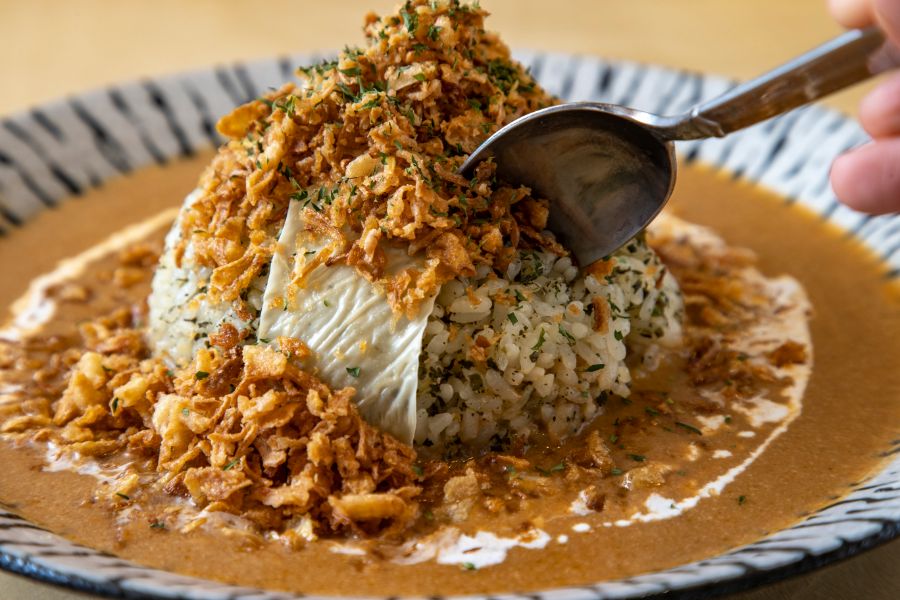 一番人気の「薬膳カレー揚玉葱」には、たっぷりの揚玉葱がトッピングされています。