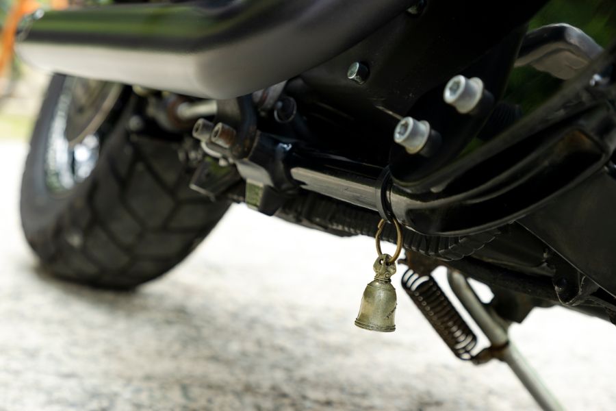 地面の邪気を祓ってくれるので、地面の近いところにつけるのが良いそう。バイクの振動によっては、チリンチリンと綺麗な鈴の音が聞こえます。
