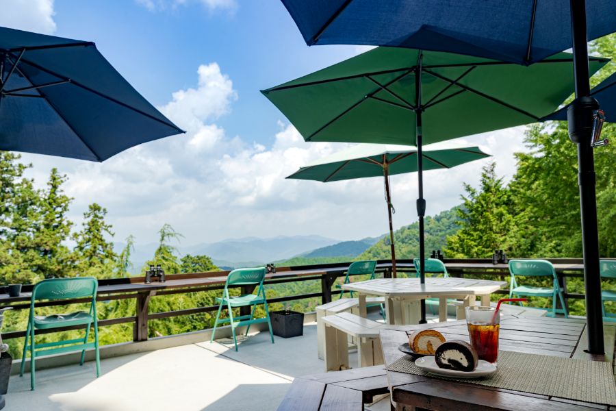 清廉とした空気が漂うお寺の境内に、2016年にオープンした「ほんたき 山のカフェ」は、月曜と週末、祝日のみの営業ですが、妙見山の中腹からの美しい景色とパティシエが作る本格スイーツで、ハイカーたちから人気を集めているんです。