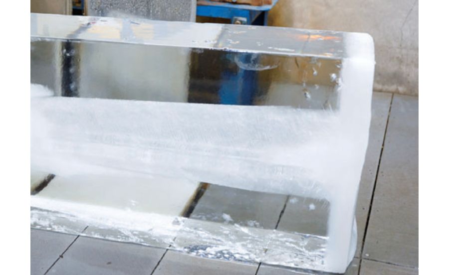 純氷の原料はもちろん水。といっても、初期の段階では特別な水ではないそう。まずは活性炭ろ過装置や逆浸透膜ろ過装置などでカルキや臭気を吸着・除去するところからスタート。フィルターを通して水を磨いていきます。ろ過した原料水を満たしたアイス缶を、約-10℃に保ったブラインと呼ばれる大きなプールの中につけ、凍らせます。