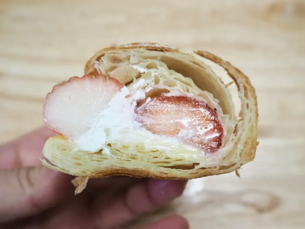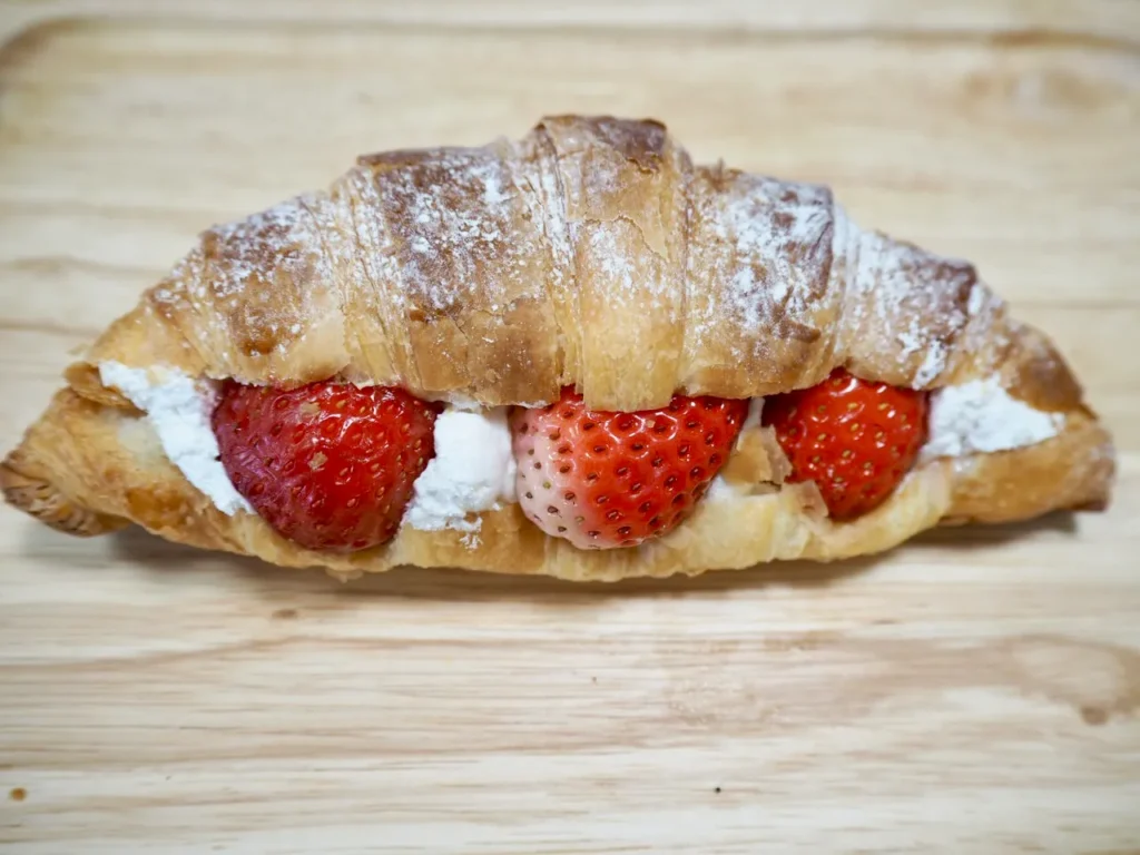 特徴: 人気のふわっとしたクロワッサンにホイップクリームとイチゴをサンドした定番の一品。スイーツ感覚で楽しめます。