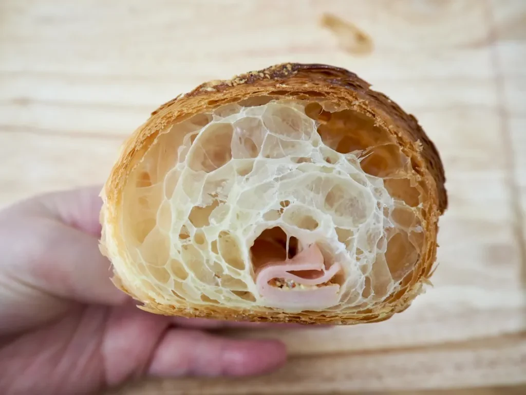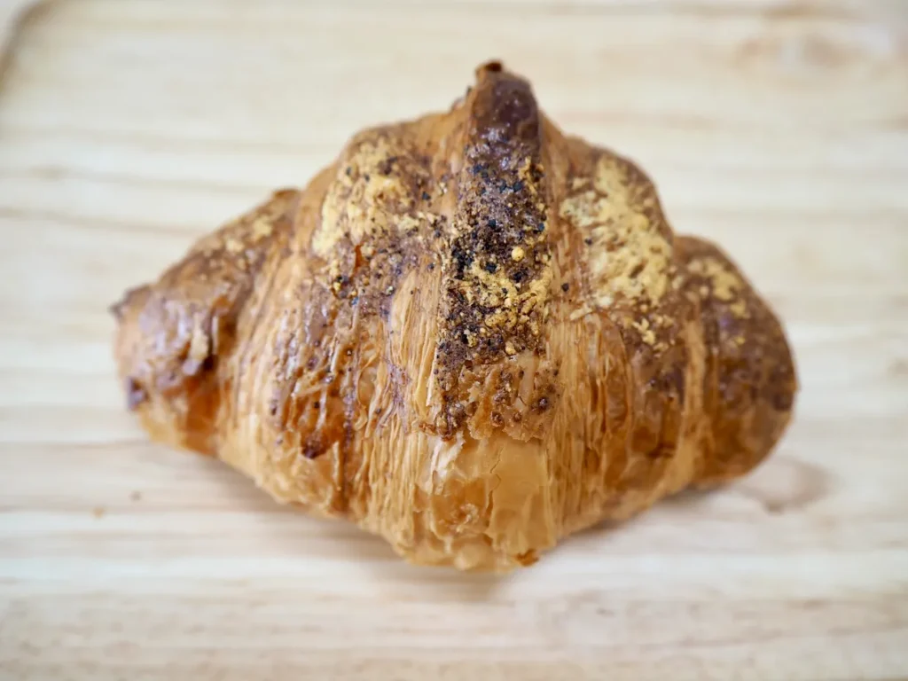 特徴: クロワッサンにチーズをかけてハムとマスタードを包み焼いた一品。一見するとハムの割合が少なそうですが、マスタードも含めちょうどいいバランスに設計されています。