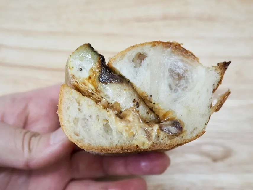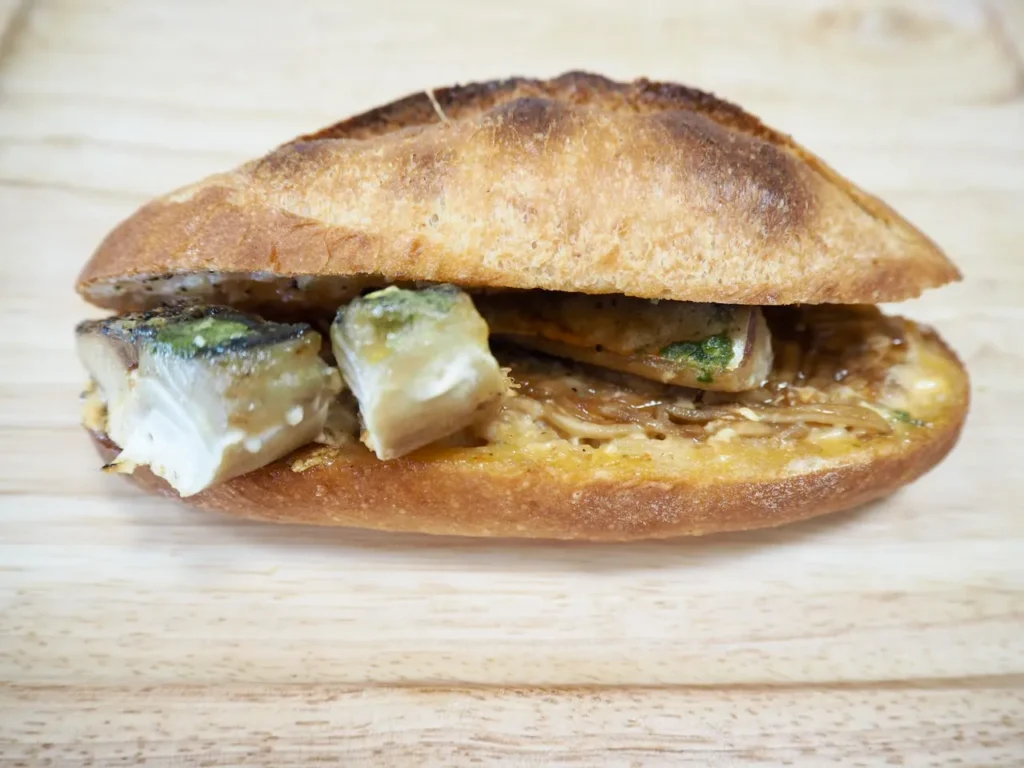 特徴: バジリコペースト、バルサミコソース、タルタルソース、セロリラペでバランスが整えられた、ハードな生地に肉厚のサバがサンドされたお食事パンです。