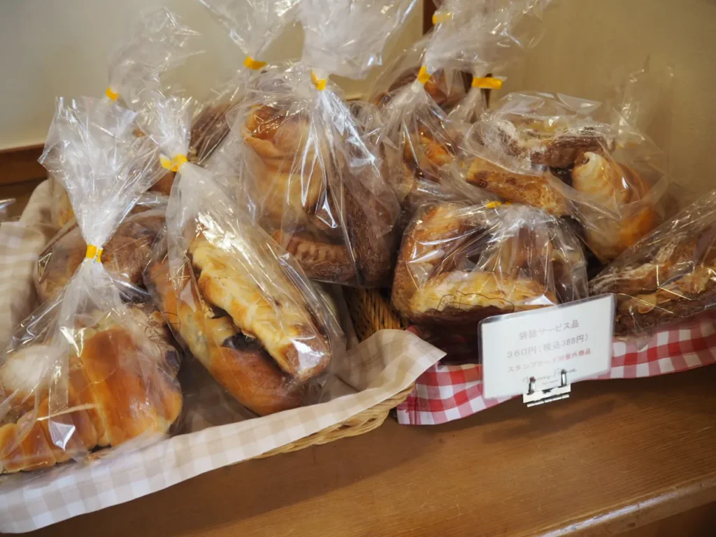 定番のクロワッサンなどハード系からスイーツ系まで、焼きたてのパンが所狭しと店内に並んでいます。袋詰サービス品が税込388円で売られていました。詰め合わせでこの価格なのでかなりお得そうですね。価格帯は200円~300円台が中心で、今回の購入分の平均価格は360円ほどでした。