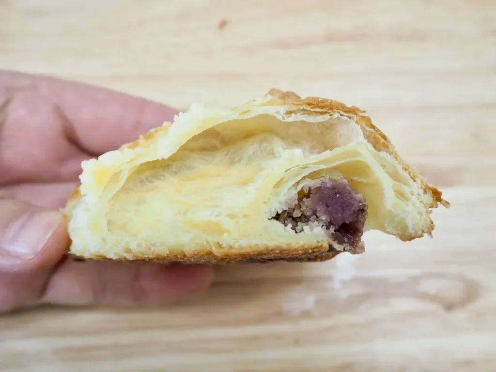 特徴: サクサクのデニッシュに甘さ控えめの自家製粒あんを包んで、自家製そぼろをつけて焼き上げた一品。あんが最高においしいです。