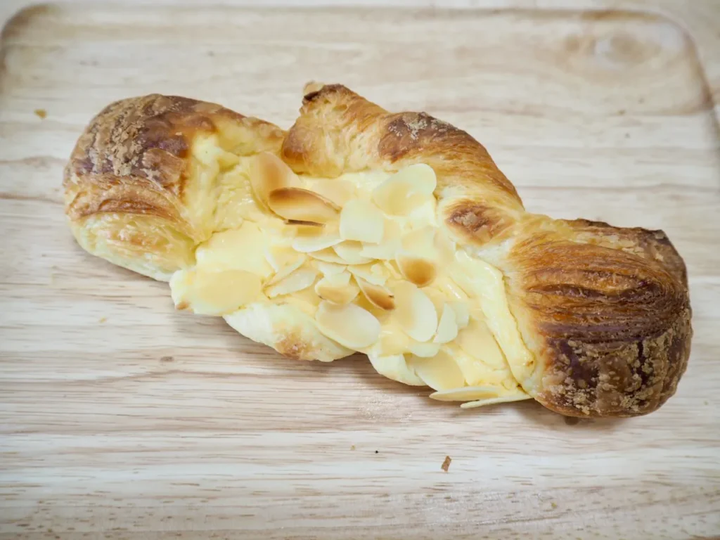 特徴: デニッシュ生地に自家製バニラクリームとバナナ、アーモンドクリームを包み、アーモンドを乗せて焼いた一品。クレープのような感覚で楽しめます。