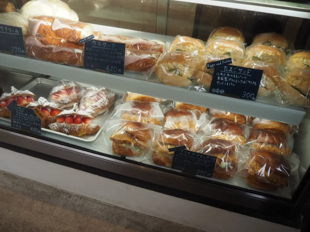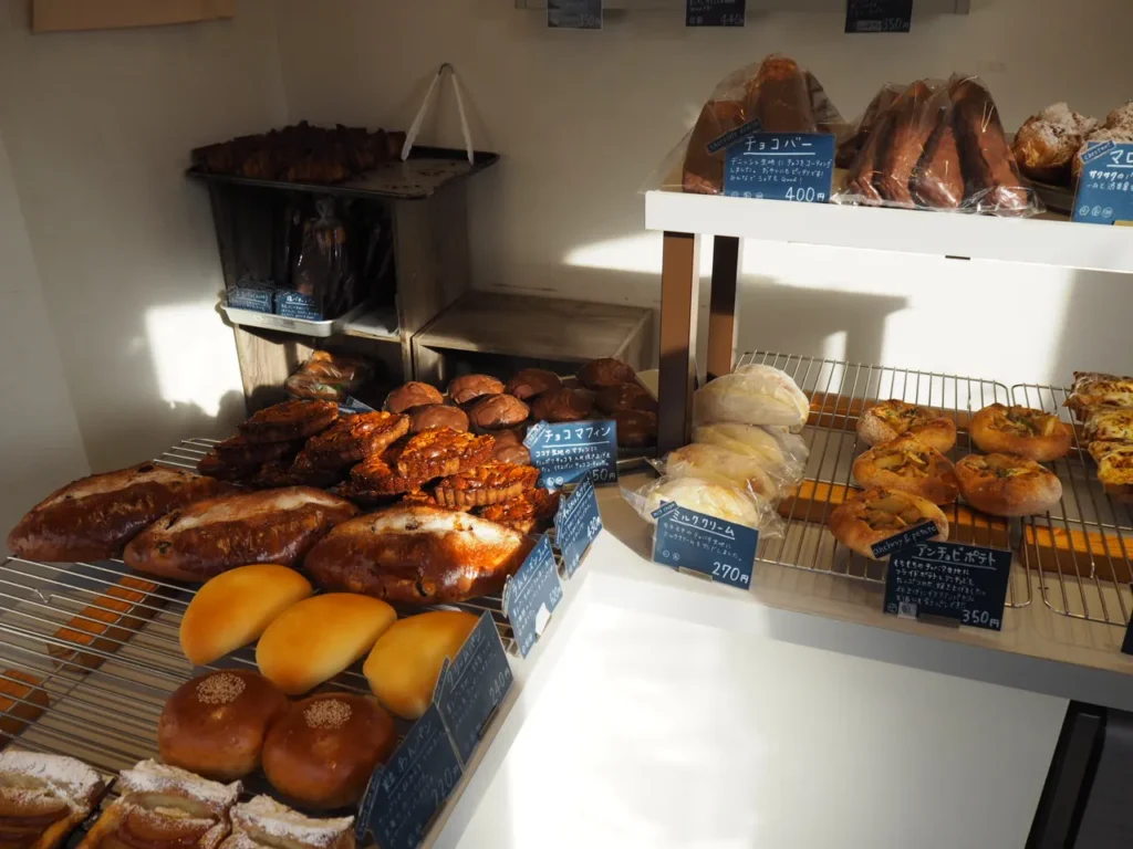 バゲットから食パン、クロワッサンにフィナンシェやスコーンなど、オシャレでスタイリッシュな店内には幅広い商品が並べられています。価格帯は200円~300円台が中心で、今回の購入分の平均価格は320円ほどでした。高級食パンのイメージが強いお店ですが、比較的リーズナブルですね。