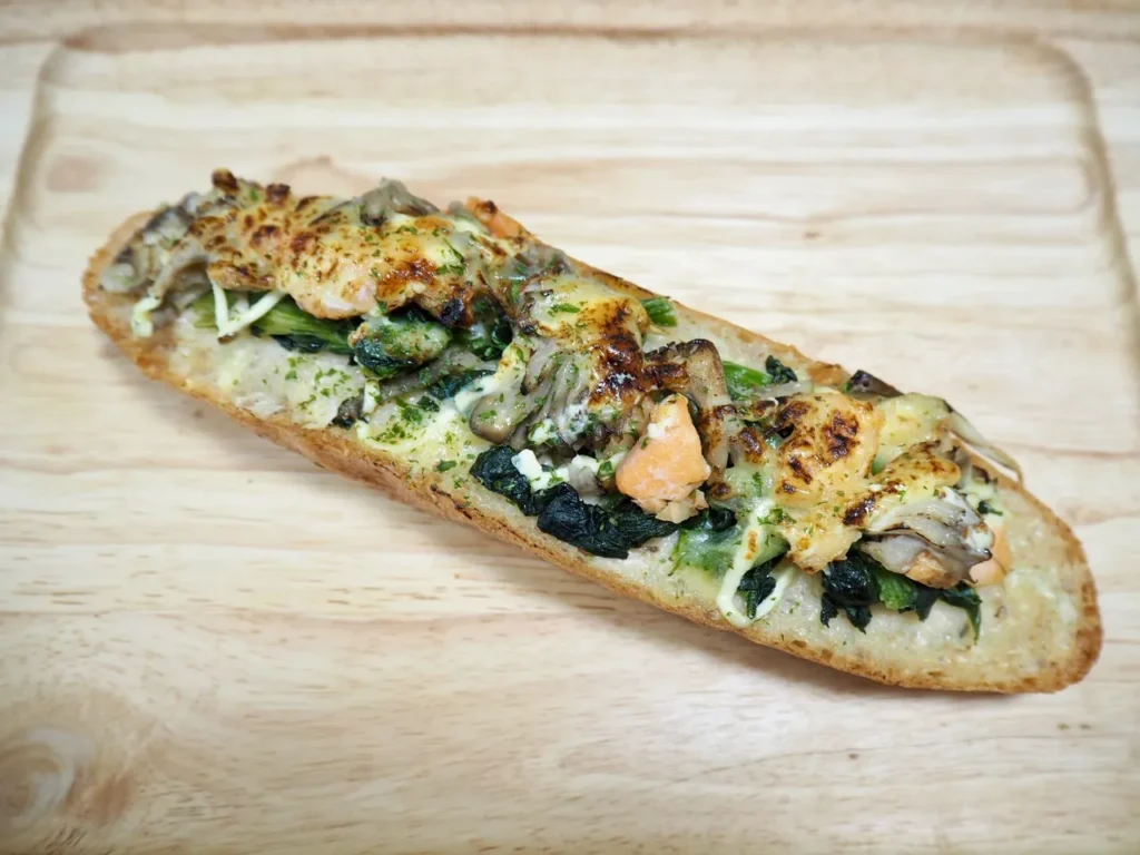 特徴: サーモンとホウレンソウときのことチーズを乗せ焼いた鉄板の一品です。