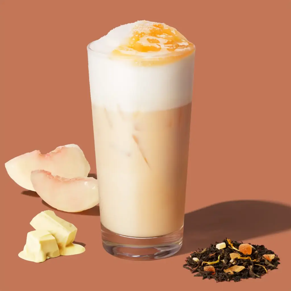 ふんわりティームース×ホワイトピーチ果肉ソース×ホワイトチョコレートパウダー ホワイトピーチのやさしい甘さと表情豊かな「ジョイフルメドレー」 のティーラテは、ホットとアイスの2種類がある。