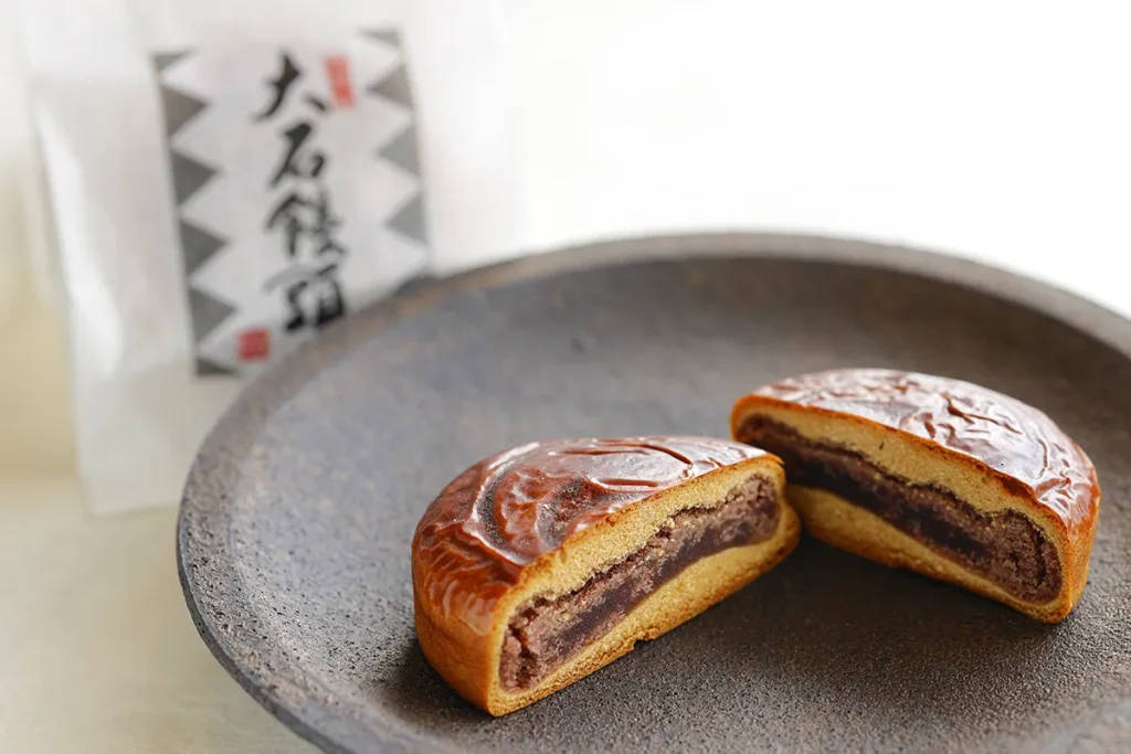 この「大石饅頭」は、「塩芳軒」の銘菓「聚落(じゅらく)」と同じ製法で、和菓子によく使われる和三盆糖を精製する際に出る和糖蜜を練り込んだ生地にこしあんを包んで焼き上げます。飴色の深い焼き色の表面には、討ち入りにちなんで陣太鼓の焼印が押されています。じっくり焼き上げられているので、口に入れるとこしあんがホロリ。皮のほろ苦さとのバランスがなんとも見事な調和を感じさせます。