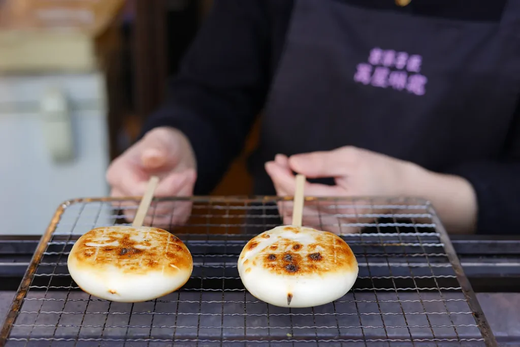 現在、「道晴餅」は、「萬屋琳窕本店」と「山科 わかさ屋」で販売されています。「萬屋琳窕本店」の「道晴餅」は、大きめに伸ばした米粉の焼き餅に白味噌と黒糖で作った甘辛いタレを絡めていただきます。店頭で焼かれているので、当時の旅人気分も味わえますね。