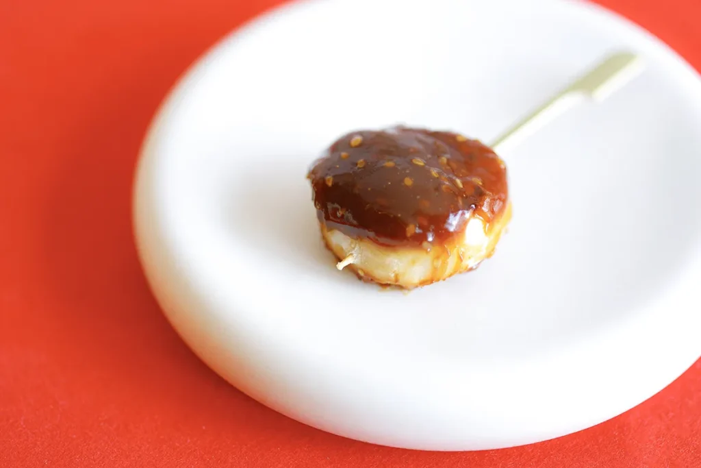 「山科 わかさ屋」の「道晴餅」は、お餅のつぶ感が特徴的。「当時は石臼か何かで粉を挽いていたと思うのですが、今のように均一にはできなかったはず」。「山科 わかさ屋」では、餅をつくる際に、わざとご飯を入れてつぶ感を演出しています。タレは西京味噌と赤味噌。素朴な味わいが楽しめます。