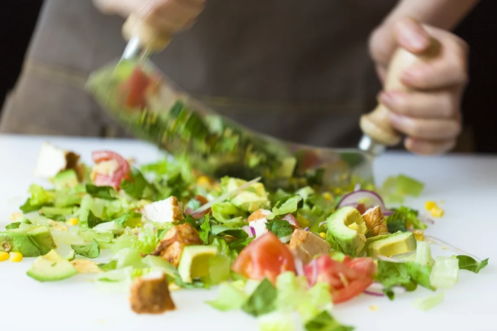 サラダは、注文を受けてから厳選した旬の野菜や果物をチョップ(細かく刻む)し、スプーンで食べる「ボウル」、トルティーヤにサラダを包んだ「ブリート」など、好みのスタイルで楽しめます。ドレッシングは無添加にこだわり、店舗で一から手作りすることで、食材そのものの味わいを最大限に引き立てています。
