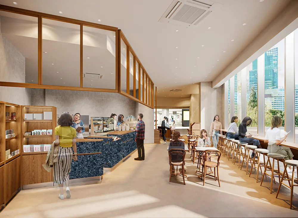 店内は「土」「木」などの自然素材を使用し、緑あふれる駅前広場に調和したパークサイドにあるショップをイメージ。