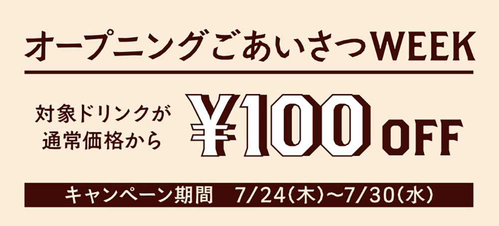 7月24〜30日は、カフェラテやホットコーヒー、アイスコーヒーが100円引になる特別週間を実施。さらに期間中は、先着3,000組様限定で、1会計につき1枚、7月31日(木)から使える10%OFFチケットのプレゼントも。