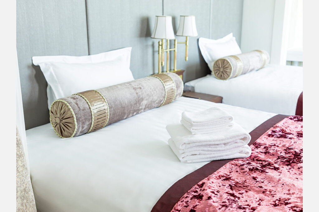阪急阪神ホテルズでは、連泊されるお客様を対象に、1泊目に使用した客室内のリネン類をそのまま再使用いただくことで、洗濯によって排出する汚水量の低減と節水に努めている。さらに、節約できた洗濯代の一部は、各地域の環境保全団体などへ寄付を行っている。
