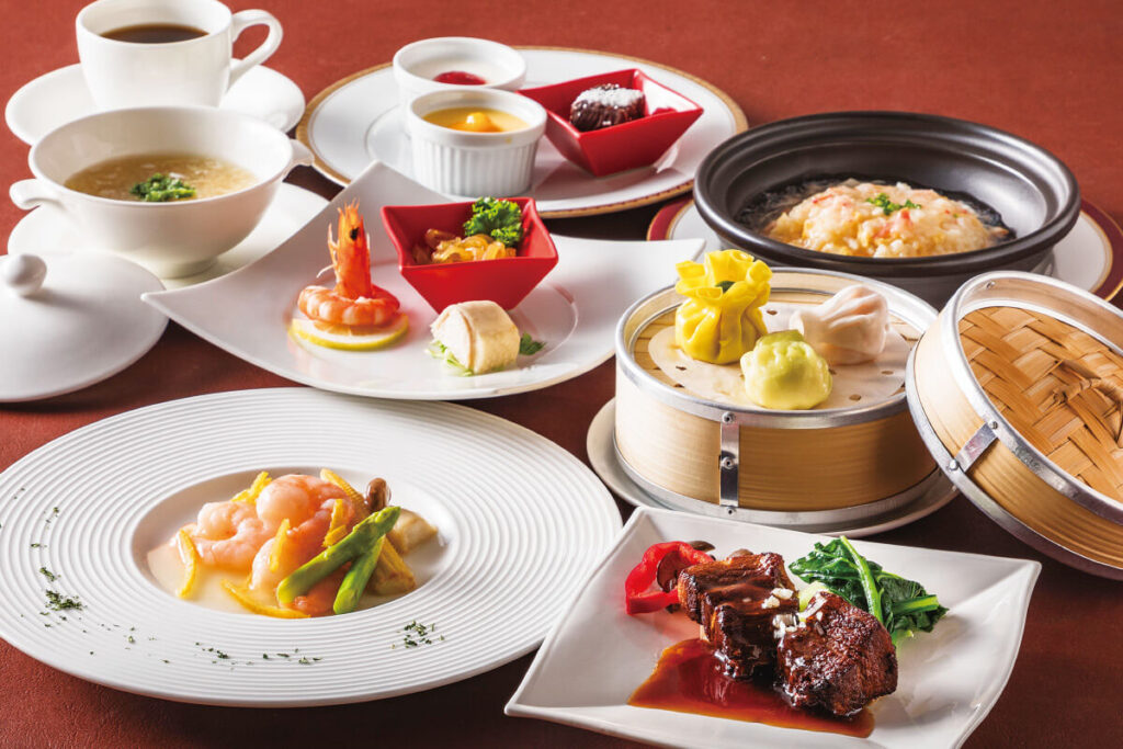 前菜の盛り合わせに肉料理や魚介、点心まで味わえる全7品のバラエティー豊かなランチコース。デザート3種と食後のコーヒーもセットになった至福のコースを心ゆくまで楽しんで。