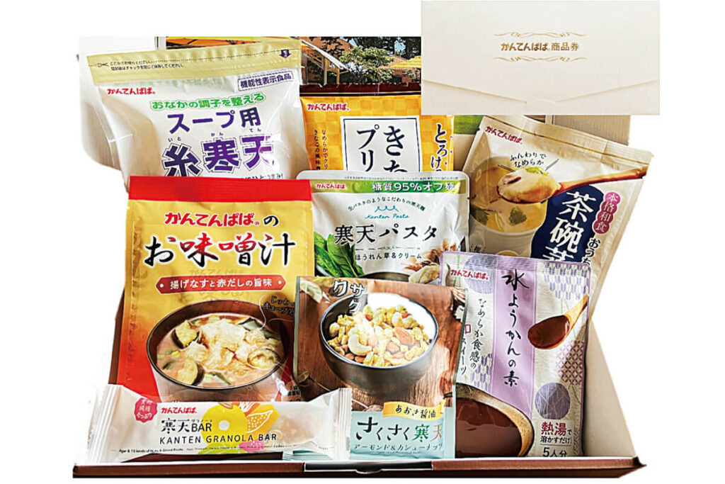 生パスタ食感の寒天パスタや、熱湯だけで簡単に作れる水ようかんの素といった「健康」と「ちょっと手づくり」がコンセプトのかんてんぱぱ製品の詰め合わせと、1,000円分の商品券がセットに!
