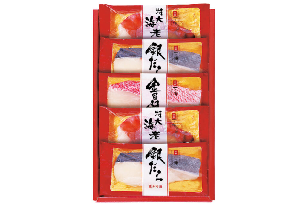 看板商品の「銀だら 蔵みそ漬」をはじめ、2番人気の「金目鯛 蔵みそ漬」、西京漬には珍しい甘みをたっぷり蓄えた「特大海老 蔵みそ漬」の3種(計5切)を詰め合わせた贅沢(ぜいたく)なギフトセット。
