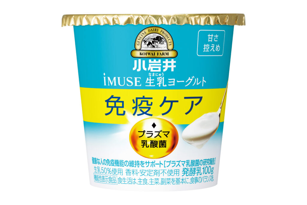 免疫で日本初!※の機能性表示食品キリン独自素材<プラズマ乳酸菌>1,000億個含有の小岩井 iMUSE(イミューズ)ヨーグルトシリーズ。乳のおいしさにこだわり、生乳を50%使用した香料・安定剤不使用で、甘さ控えめのヨーグルト。