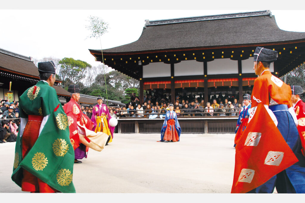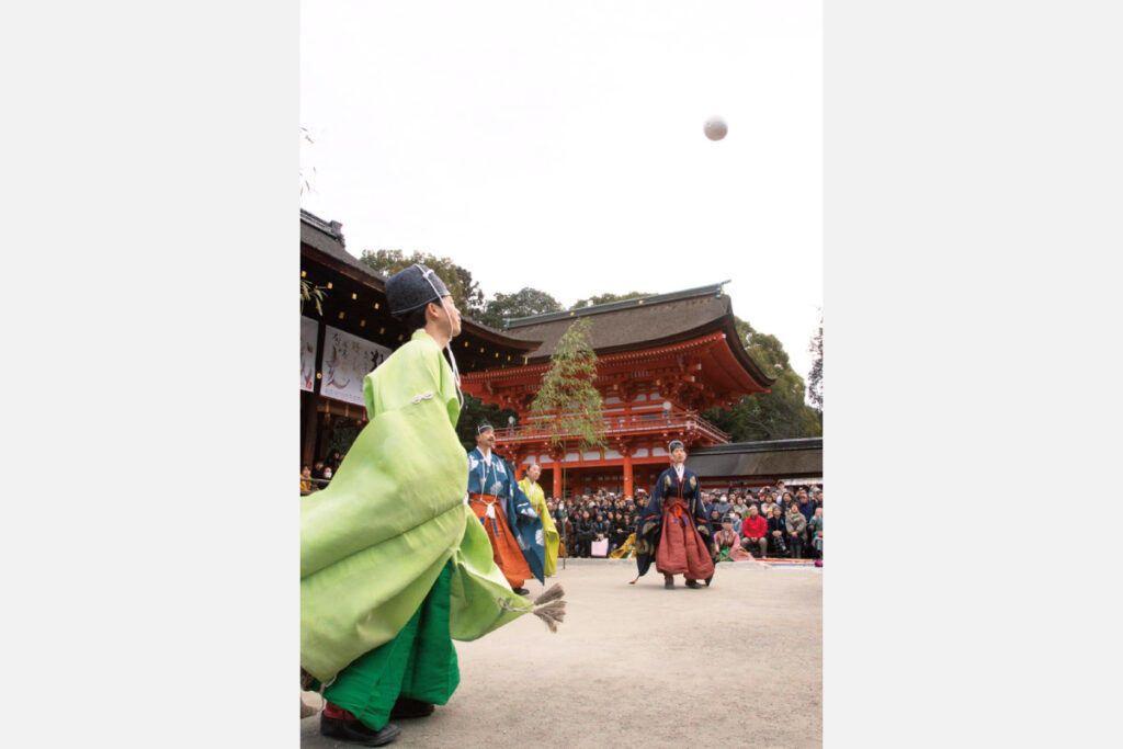 江戸時代には庶民の間でも蹴鞠が大流行、鞠場(まりば)が設けられ、女性が鞠を蹴る様子も絵に残されている。明治維新後は一時後退したものの、旧公家を中心に蹴鞠は継承され、明治天皇の「蹴鞠を保存せよ」との勅命(ちょくめい)を受け、現在の蹴鞠(しゅうきく)保存会が設立されたそう。この伝統を新年に奉納するのが下鴨神社の「蹴鞠はじめ」である。