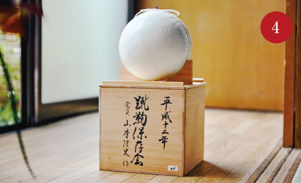 現在、蹴鞠に使用する鞠を作れるのは山本さんのみ。この機会に鞠作りについてもお話を伺った。「鞠は紙風船の革版だとイメージしていただくと分かりやすいと思います。古道具屋で買った鞠を使用していた時期もありますが、作れた方が良いと決心し、文献などを参考に制作を始めました。鞠を作ることを鞠括(くくり)と言い、室町時代以降、職人は御鞠師という家業として成立していたのですが、今は私が1人で作りながら後進を育てています。自宅の作業場では、革を揉んで柔らかくするところからスタートし、約1カ月に1つのペースで制作しています。