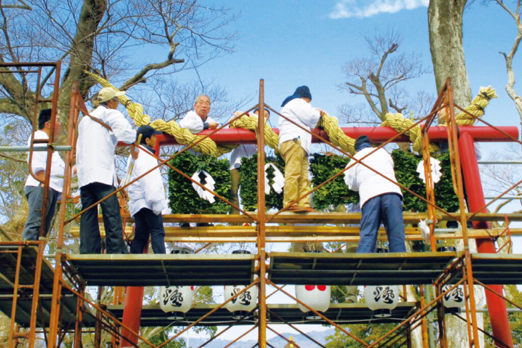 毎年、8日の午前中に氏子の方と小綱36本(うるう年は37本)を12本ずつ、3束にして練り合わせ大綱を作ります。大綱を鳥居に巻く際は『罪穢れを流す』の意味を込めて3巻半とし、8本の矢を刺した後、榊(さかき)葉をつるした上へ御幣(ごへい)、麻緒(あさお)を付けて完成です。大綱は龍を、8本の白矢は『古事記』『日本書紀』に登場する八色雷公(やぐさのらいこう)を表し、鳥居に龍と雷の神をお招きすることで厄払いとしてはかなり強力なものとなり、鳥居自体が祓(はら)い具になるとされています。両日とも皆さまに甘酒やしょうが湯の接待を執り行いますのでぜひお越しください」とのこと。