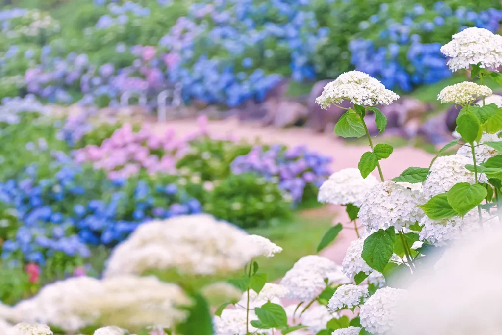 「あじさいの小径」では、斜面を覆いつくすようにあじさいが植栽されています。