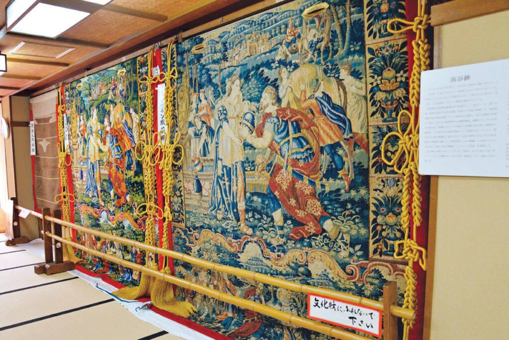毎年宵山期間になると、函谷鉾保存会町会所で復元前後のタペストリーが並べて展示される。繊細な色のグラデーション、人物の頬の艶を表現するため使用された絹糸など、間近で見ることで職人たちの細部の技に気づく。「ぜひ隅々までチェックしてください」。