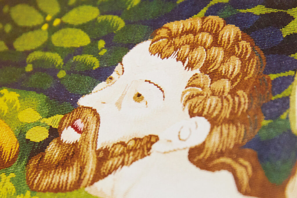 試し織りでは「日本の職人が織ると、なぜか日本人の顔立ちになってしまう」という予想外の壁にもぶち当たったそう。試作を繰り返し、5人の職人によって完成したタペストリーは2005年にお披露目された。