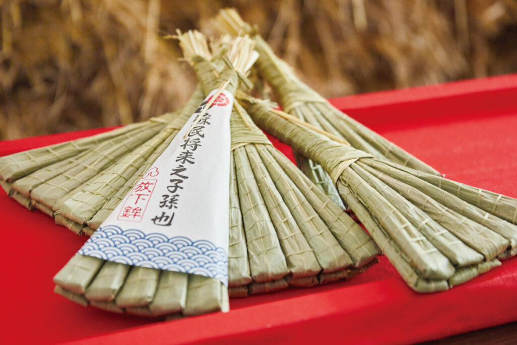 「こだわっているのは形の美しさ」と言うのは、作り手の一人・小池さん。まるで勝手に手が動いているような速さで藁に笹の葉を巻き、1本ができ上がった。1分ほどの間だが「葉の中心が中央にくるように」「角をきれいに整えて」と細部まで目を光らせている。できたものを10本まとめ、い草で束ねて完成するのだが、そこにも「着物の前合わせをイメージして美しく」という小池さんの美意識が表れている。今に継承された京都産のチマキを玄関に飾って、家族の安寧を願おう。