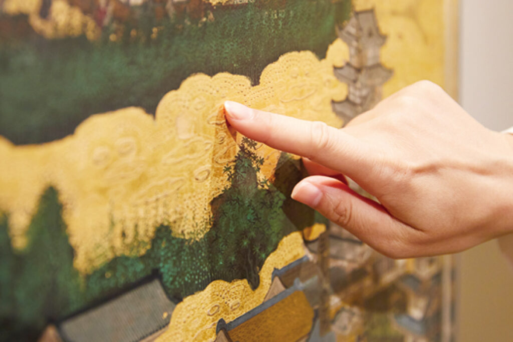 約5年にわたる研究を経て、金箔の上に印刷できる技術を開発し特許を取得。デジタル技術の匠たちによる印刷により、原画に残る小さな傷や金箔が重なった立体感までもが忠実に再現されている。実際に手で触れることができる展示もあるので、その技術を確かめてみて。