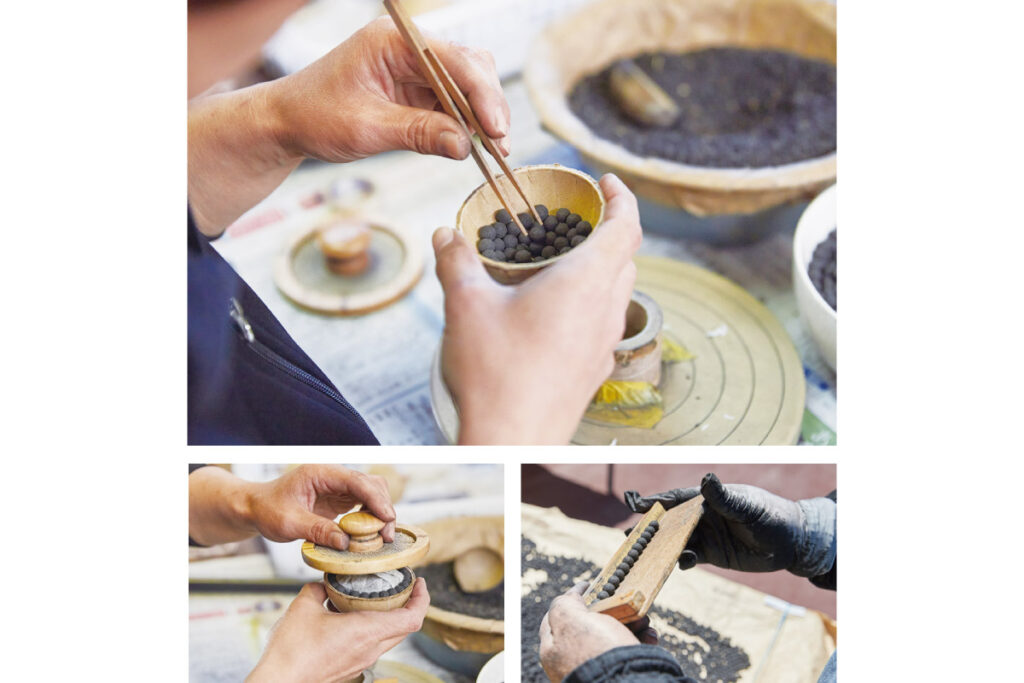 次に行う玉込め作業は、機械化が難しくすべて職人が手作業で行っている。玉の半分それぞれに規則正しく星を並べ、その中心に着火剤となる火薬を詰めるのだが、「ポイントは程良い隙間を作ること。そうすることできれいに割れます」と喜田さん。そのさじ加減は、職人が何度も繰り返し作った経験で得られるものだ。
