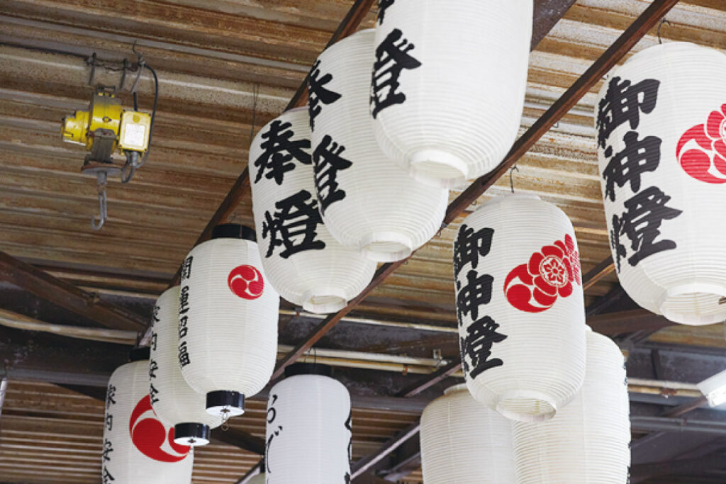 祭りの期間中掲げられる提灯は、町によって文字やデザインが違います。それぞれに意味があるので観察すると楽しいですよ。